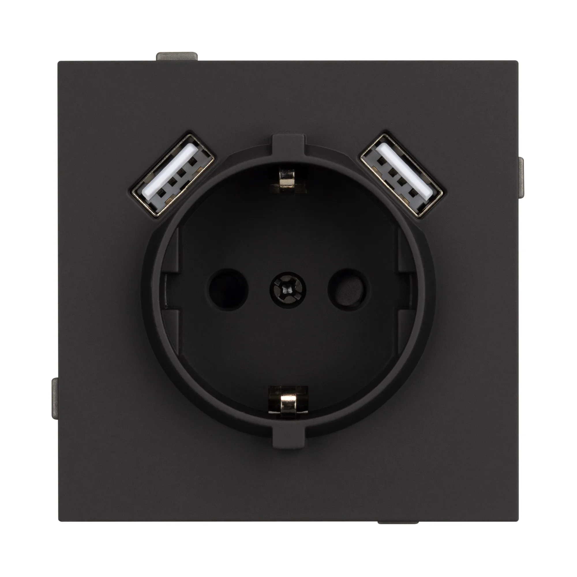 Механизм розетки с USB зарядкой, совместимый с рамками серии NOBE, создает утонченный минималистичный вид. Наличие двух USB Type A портов позволяет существенно сократить количество используемых розеточных постов под евровилку, сохраняя единую стилистику интерьера всего современного дизайн-проекта. Видимая часть механизма выполнена из высококачественного пластика матового черного цвета и имеет Soft-Touch покрытие, что придает изделию приятные тактильные ощущения и стильный внешний вид.