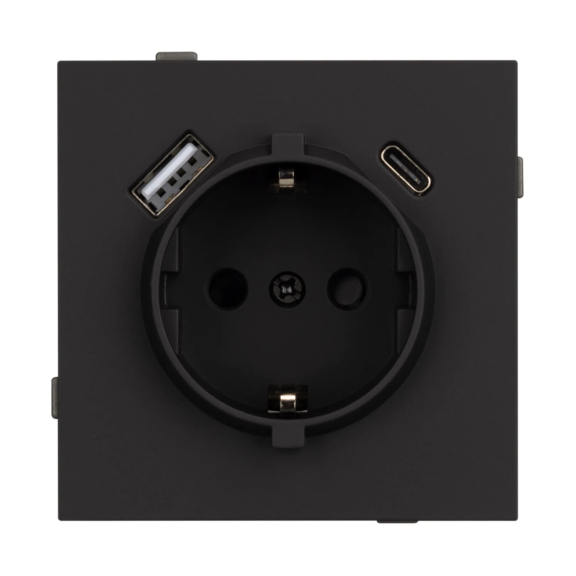 Механизм розетки с USB зарядкой, совместимый с рамками серии TENDO, создает утонченный минималистичный вид. Наличие двух USB Type A + Type C портов позволяет существенно сократить количество используемых розеточных постов под евровилку, сохраняя единую стилистику интерьера всего современного дизайн-проекта. Видимая часть механизма выполнена из высококачественного пластика матового черного цвета и имеет Soft-Touch покрытие, что придает изделию приятные тактильные ощущения и стильный внешний вид.