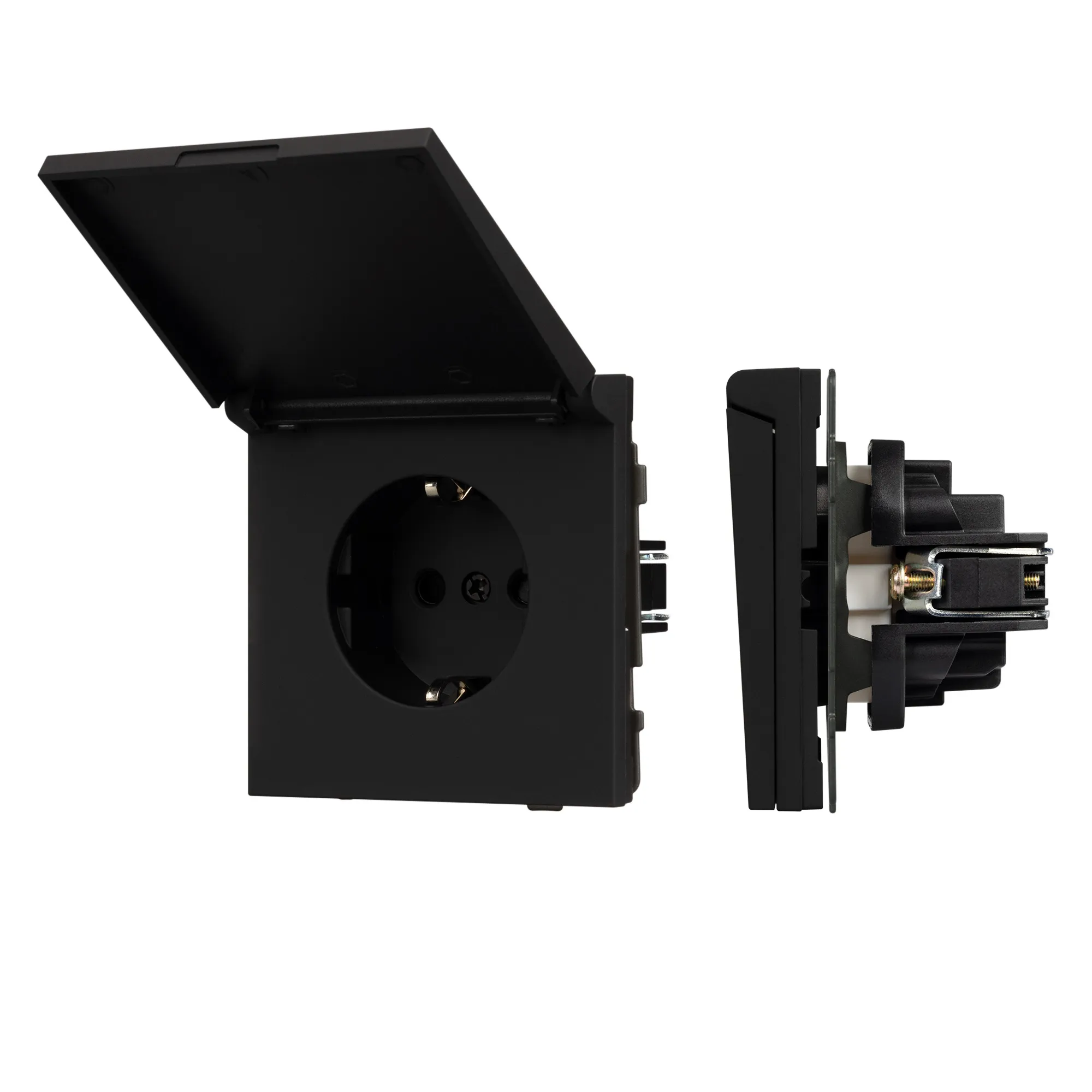 Механизм розетки с заземлением и влагозащитной крышкой совместим с рамками серии TENDO, создает утонченный минималистичный вид. Скрытый тип монтажа позволяет гармонично встроить в интерьер любого современного дизайн-проекта. Видимая часть механизма выполнена из высококачественного пластика матового черного цвета и имеет покрытие Soft-Touch.