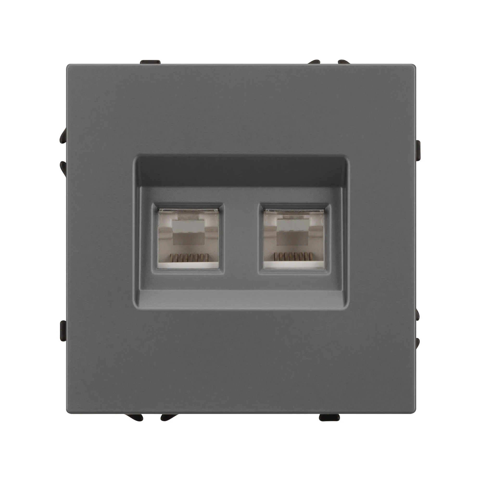 Механизм сдвоенной компьютерной розетки совместим с рамками серии NOBE, создает утонченный минималистичный вид. Скрытый тип монтажа позволяет гармонично встроить в интерьер любого современного дизайн-проекта. Видимая часть механизма выполнена из высококачественного пластика цвета серый базальт и имеет Soft-Touch покрытие, что придает изделию приятные тактильные ощущения и стильный внешний вид.