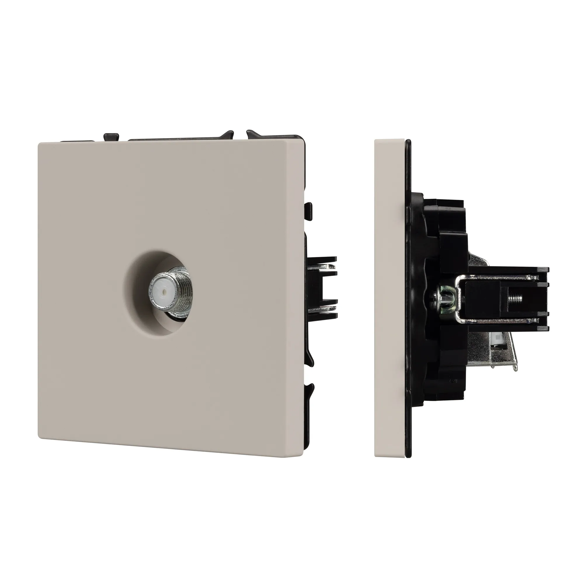 Механизм спутниковой розетки предназначена для подключения спутникового телевидения, путем подсоединения коаксиального кабеля к винтовому зажиму. Усиленные распорные лапки двойного захвата надежно фиксируют устройство в установочном подрозетнике круглого сечения диаметром 60мм.