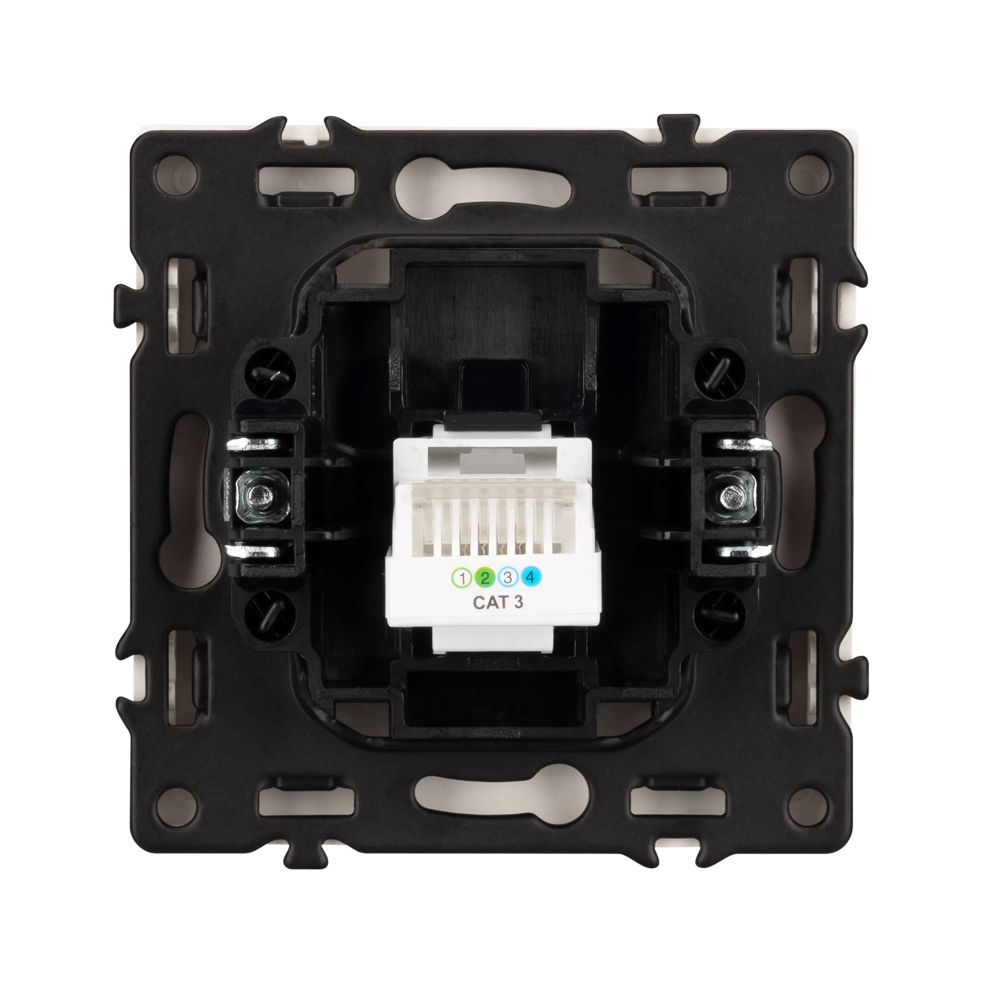 Выходной порт RJ-11 (Female) формата 6P4C соответствует категории 3 (Cat.3). Самозакрывающаяся крышка защищает выходной порт от повреждения и загрязнения внешних контактов разъема. Контактная часть выполнена по технологии IPC (изоляционно–пробивающего контакта) с нанесением цветной маркировки схемы разводки на корпус, позволяя быстро и легко подсоединить механизм компьютерной розетки к большинству многожильных кабелей типа UTP (неэкранированные). А усиленные распорные лапки двойного захвата надежно фиксируют механизм в установочном подрозетнике круглого сечения диаметром 60мм.