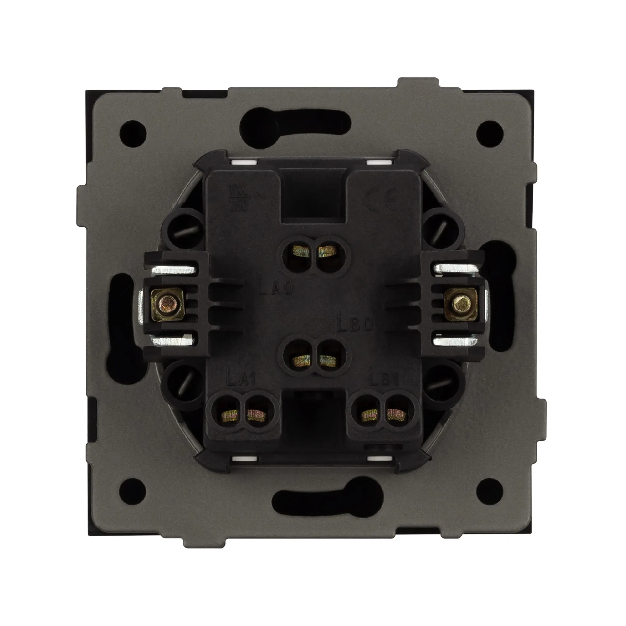 Контактная часть присоединяется при помощи винтовых зажимов, позволяя надежно подсоединить механизм выключателя к питающим элементам. А усиленные распорные лапки двойного захвата надежно фиксируют механизм в установочном подрозетнике круглого сечения диаметром 60мм.