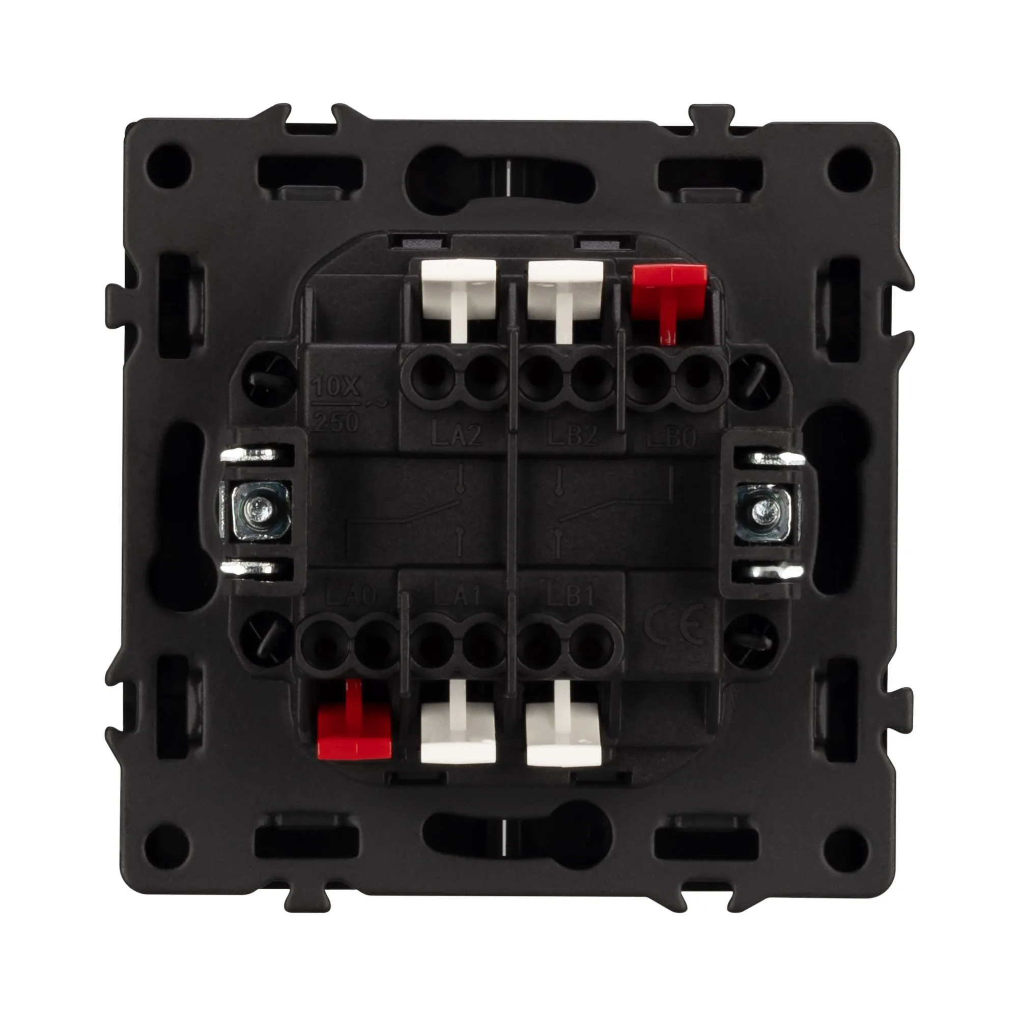 Соединение посредством быстрозажимных контактов, позволяет надежно подсоединить механизм выключателя к питающим элементам, минимизируя затраченное время на монтаж. А усиленные распорные лапки двойного захвата надежно фиксируют механизм в установочном подрозетнике круглого сечения диаметром 60мм.