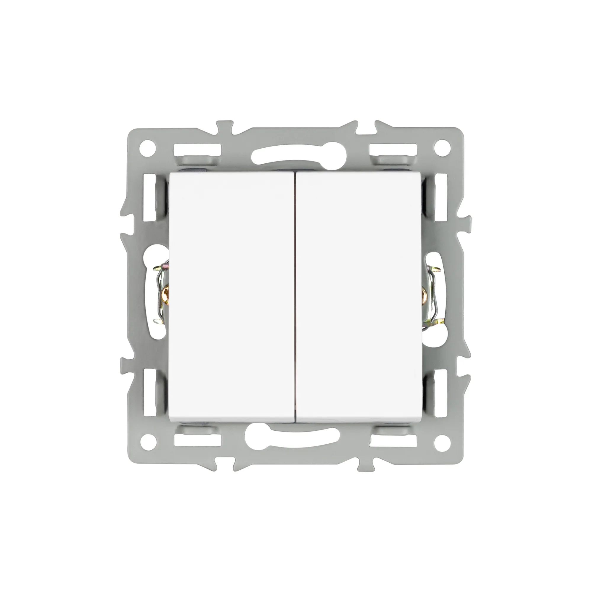 Механизм выключателя света двухклавишный на 1 пост, совместим с рамками серий VERSA/GLARE/PRESTO. Скрытый тип монтажа позволяет гармонично встроить в интерьер любого современного дизайн-проекта. Видимая часть механизма выполнена из высококачественного тугоплавкого пластика белого цвета. Контактная часть присоединяется при помощи винтовых зажимов, а усиленные монтажные лапки надежно фиксируют механизм в установочном подрозетнике. Проходная система подключения, позволяет управлять системой освещения из двух разных точек.