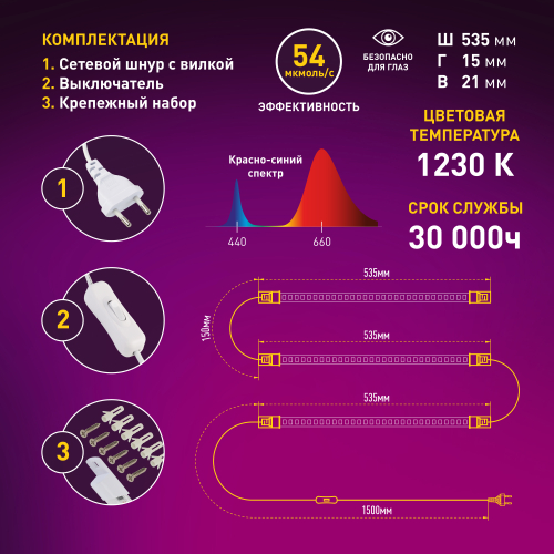 Модульный светильник для растений ЭРА FITO-3х10W-LINE-RB90 красно-синего спектра 30 Вт отлично себя зарекомендовал для стеллажной подсветки Ваших домашних любимцев. Прекрасно подходит для любых сортов и видов растений в случае присутствия в комнате хотя бы слабого естественного освещения. Полностью восполнит недостаток солнца для зелени и пасленовых. Рекомендуемое расстояние до листьев растений от 7 до 25 см. Светильник укомплектован проводом 1,5 м с выключателем. Длина провода между модулями около 15 см. Модули имеют прозрачный корпус, что позволяет передать на растения всю световую энергию. Поликарбонатный пластиковый прозрачный профиль и алюминиевые печатные платы внутри смотрятся минималистично и вписываются в любой, даже очень притязательный интерьер. Данное решение позволит создать био сад премиум класса.
