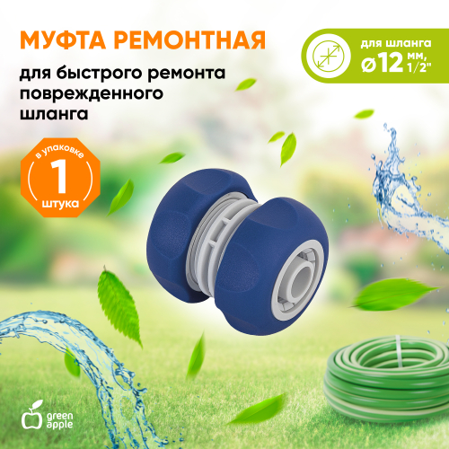 Ремонтная соединительная муфта "Green Apple" предназначена для быстрого ремонта поврежденного шланга 12 мм. После удаления поврежденного участка новые концы шланга легко соединяются с помощью муфты. Особенностью изделия является покрытие ручки TPR soft. Длина: 5 см.