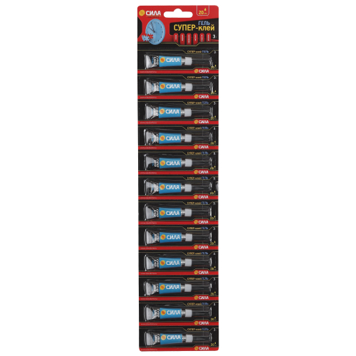 Набор 12 шт. супер-клея ГЕЛЬ СИЛА, идеально подходит для быстрого и эффективного ремонта различных предметов мебели, интерьера, обуви и т.д. Накрепко схватывает дерево, кожу, резину, керамику, фарфор и пластик, при этом супер клеи экономично расходуются и высыхают за несколько секунд. Не растекается и не капает.