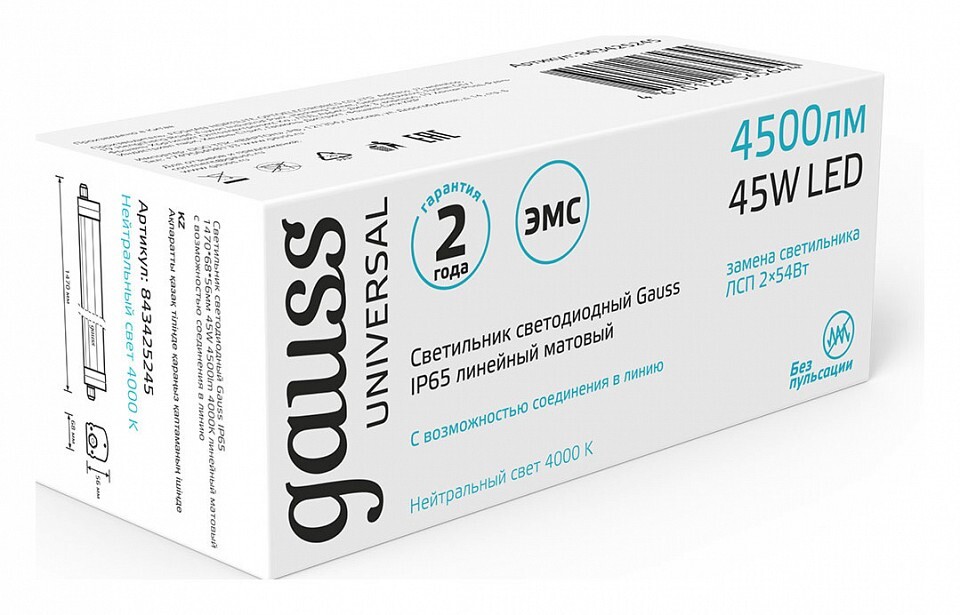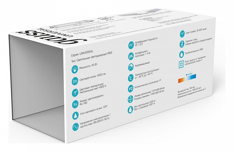 Светильники ЛСП IP65 Universal с цветовой температурой 4000К и 6500К предназначены для освещения автомоек, парковок, подсобных помещений, пешеходных переходов и лестничных пролетов, и других помещений, где требуется высокий уровень защиты от пыли и влаги IP65. Особенностью данной серии является возможность подключения светильников в линию до 20шт. Эта функция снимает необходимость подводить кабель питания 220В к каждому светильнику, что значительно ускоряет монтаж и снижает издержки на материалах и оплате услуг электромонтажников. Качественные светодиоды Sanan с эффективностью до 90 лм/В и широкий диапазон рабочих температур -40 + 45°C позволяет использовать серию Universal в профессиональном сегменте, где требуются светильники с высокой светоотдачей и стойкие к внешним факторам окружающей среды.