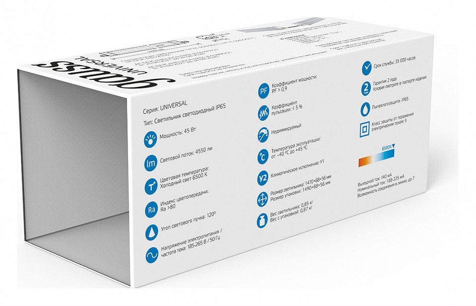 Светильники ЛСП IP65 Universal с цветовой температурой 4000К и 6500К предназначены для освещения автомоек, парковок, подсобных помещений, пешеходных переходов и лестничных пролетов, и других помещений, где требуется высокий уровень защиты от пыли и влаги IP65. Особенностью данной серии является возможность подключения светильников в линию до 20шт. Эта функция снимает необходимость подводить кабель питания 220В к каждому светильнику, что значительно ускоряет монтаж и снижает издержки на материалах и оплате услуг электромонтажников. Качественные светодиоды Sanan с эффективностью до 90 лм/В и широкий диапазон рабочих температур -40 + 45°C позволяет использовать серию Universal в профессиональном сегменте, где требуются светильники с высокой светоотдачей и стойкие к внешним факторам окружающей среды.