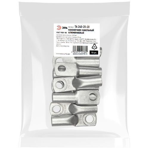 Наконечник кабельный алюминиевый ЭРА ТА 240-20-20 используется для оконцевания проводов и кабелей с алюминиевыми жилами сечением до 240 мм² и применяется для кабелей напряжением до 35 кВ.