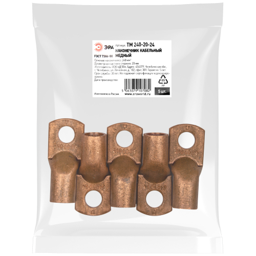 Наконечник кабельный медный ЭРА ТМ 240-20-24 используется для оконцевания проводов и кабелей с медными жилами сечением до 300 мм² и применяется для кабелей напряжением до 35 кВ.
