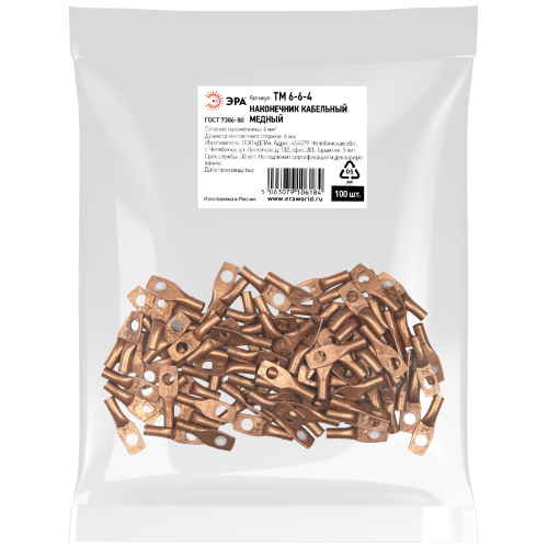 Наконечник кабельный медный ЭРА ТМ 6-6-4 используется для оконцевания проводов и кабелей с медными жилами сечением до 6 мм² и применяется для кабелей напряжением до 35 кВ.