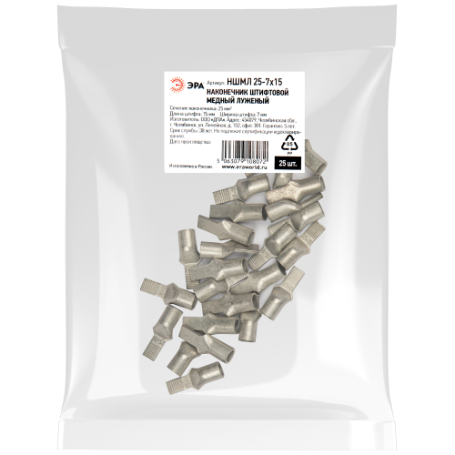 Наконечник штифтовой медный луженый НШМЛ 25-7х15 используется для оконцевания проводов и кабелей с медными жилами сечением до 25 мм² и применяется для кабелей напряжением до 1 кВ. Позволяют осуществлять подключение кабелей и проводов, сечение жил которых превышает размеры контактных клемм, при подключении к выводам автоматических выключателей и других устройств имеющих ограниченную ширину контактных клемм. Наконечники НШМЛ изготавливаются из меди марки М1. Высококачественное лужение с легирующими добавками висмута и олова гарантирует надежную защиту контактных соединений от коррозии (климатическое исполнение Т2). Для оконцевания проводников необходимо использовать специальный обжимной инструмент.