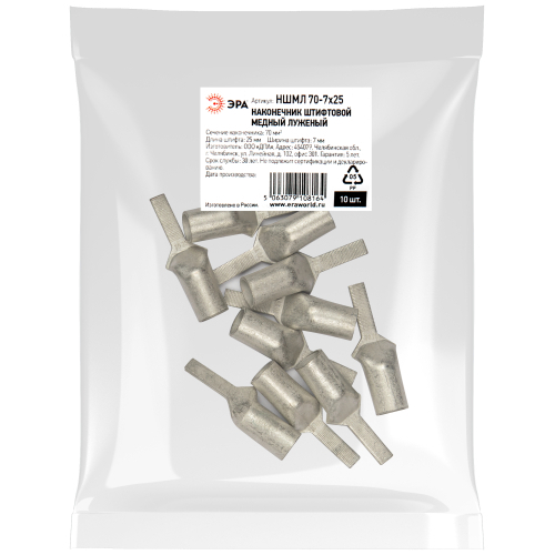 Наконечник штифтовой медный луженый НШМЛ 70-7х25 используется для оконцевания проводов и кабелей с медными жилами сечением до 70 мм² и применяется для кабелей напряжением до 1 кВ. Позволяют осуществлять подключение кабелей и проводов, сечение жил которых превышает размеры контактных клемм, при подключении к выводам автоматических выключателей и других устройств имеющих ограниченную ширину контактных клемм. Наконечники НШМЛ изготавливаются из меди марки М1. Высококачественное лужение с легирующими добавками висмута и олова гарантирует надежную защиту контактных соединений от коррозии (климатическое исполнение Т2). Для оконцевания проводников необходимо использовать специальный обжимной инструмент.