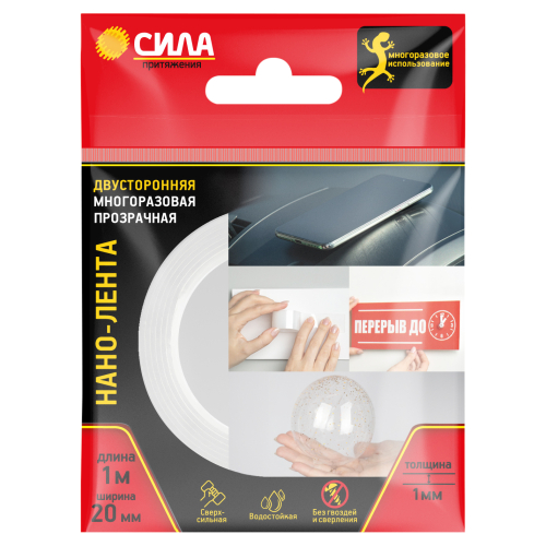 Двусторонняя многоразовая клейкая лента СИЛА (нано-скотч) – это инновационное средство крепления, которое обладает широкой сферой применения. Заменяет механический крепеж, фиксирует кухонные инструменты, ковровые покрытия, элементы декора, удлинители и хабы, картины, крючки, небольшие полки, интерьерные украшения, детали детских поделок и т.д.