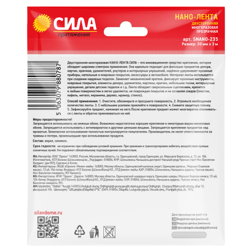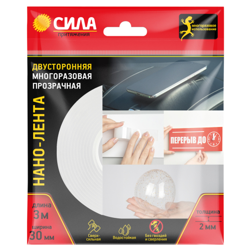 Двусторонняя многоразовая клейкая лента СИЛА (нано-скотч) – это инновационное средство крепления, которое обладает широкой сферой применения. Заменяет механический крепеж, фиксирует кухонные инструменты, ковровые покрытия, элементы декора, удлинители и хабы, картины, крючки, небольшие полки, интерьерные украшения, детали детских поделок и т.д.