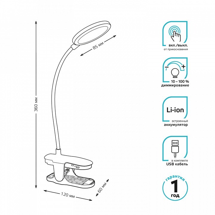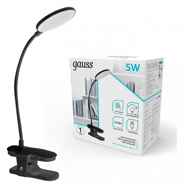 Аккумуляторный диммируемый светильник от Gauss станет для вас незаменимым помощником. Данный источник света не требует замены батареек, он светит в течение длительного времени до следующей подзарядки, а также легко заряжается. Аккумулятор Li-ion большой запас емкости и легкий вес. Потребляемая мощность 5 Вт, без мерцания, цветовая температура 4000 К - все эти параметры благоприятно влияют на работоспособность глаз во время чтения или работы. Сенсорная регулировка уровня яркости позволяет легко выбрать необходимый цвет освещения для работы, чтения, обучения или отдыха. Светильник представлен в чёрном и белом цвете, выполнен в лаконичным стиле, что подойдёт для любого интерьера. Настольная лампа от Gauss на прищепке оснащена встроенным аккумулятором. Модели на батарейках - простое практичное и бюджетное решение.