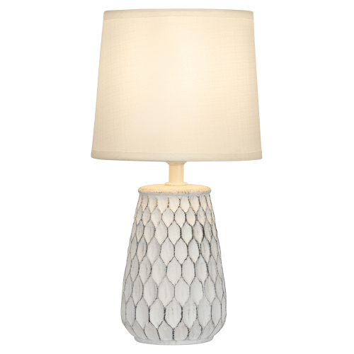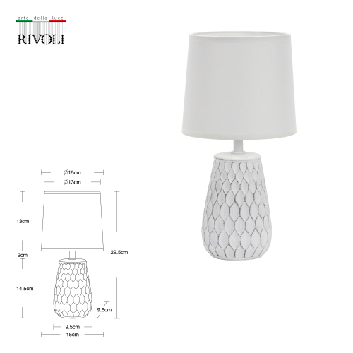 Настольная лампа керамическая Rivoli Bella (арт. 7071-502) белая, с классическим тканевым абажуром и декоративным основанием из керамики. Красивый выпуклый узор основания лампы на стол напоминает пчелиные соты. Коллекцию дополняет настольный светильник Rivoli Bella с керамическим основанием чёрного цвета – арт. 7071-501.