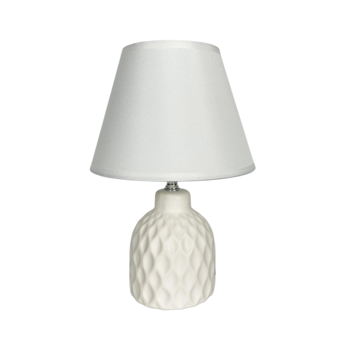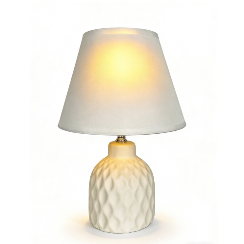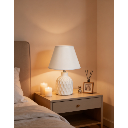 Объёмное основание с мягким рельефным рисунком напоминает игру света на текстиле или лёгкую драпировку, застывшую в матовой керамике молочного оттенка. Лаконичный белый абажур создаёт чистый, ровный свет, который мягко заполняет пространство и подчёркивает архитектуру комнаты. Такое освещение идеально для спальни. Оно формирует атмосферу уюта и спокойствия, в которой легко замедлиться и переключиться на отдых. Эта модель станет элегантным акцентом на прикроватной тумбе или консоли.