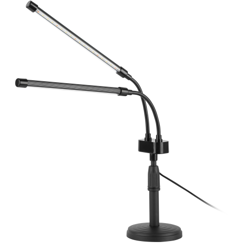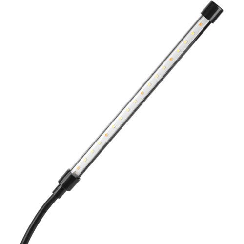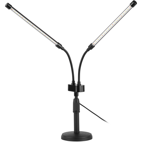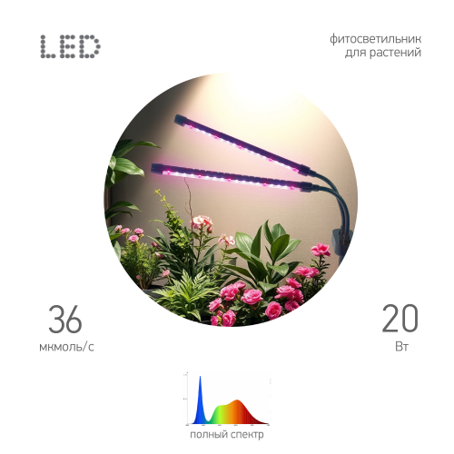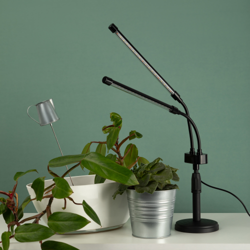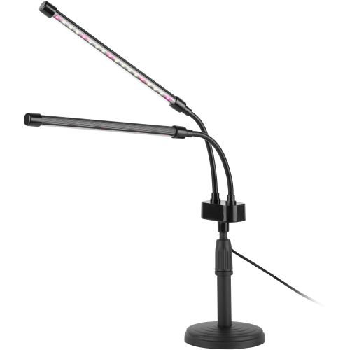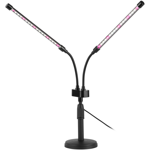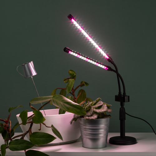 Настольный светильник полного спектра, но с красным отсветом. Подойдет для любого растения, так как в спектре излучения присутствуют все длины волн. Основной упор в излучении сделан на поддержание оптимального фотосинтеза и набор массы растением. Светильник имеет легко регулирующееся основание, два независимых по работе гнущихся плафона. Черный цвет корпуса легко вписывается в любой интерьер.