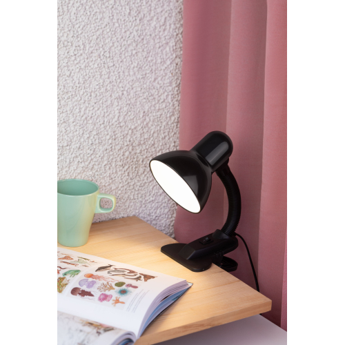 Светильник может использоваться с лампой накаливания, компактной люминесцентной лампой (КЛЛ) или светодиодной (LED) лампой. Прочная прищепка. Металлический плафон. Наклон и поворот плафона в любом направлении.