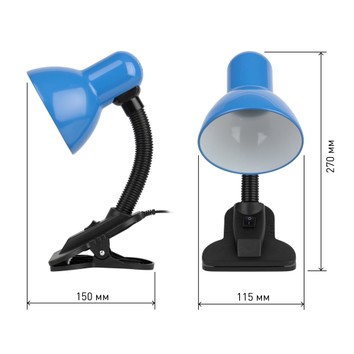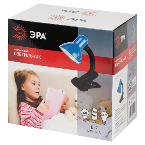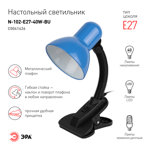 Настольный светильник-прищепка ЭРА N-102-E27-40W-BU может использоваться с лампой накаливания, компактной люминесцентной лампой (КЛЛ) или светодиодной (LED) лампой. У светильника прочная удобная прищепка и металлический плафон. Наклон и поворот плафона в любом направлении для удобного направления света. Поставляется в индивидуальной картонной коробке.
