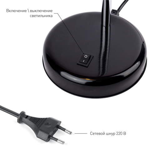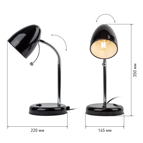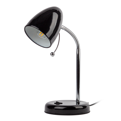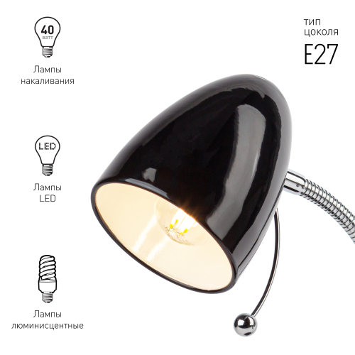 Настольный светильник ЭРА N-116-Е27-40W-BK с цоколем Е27 компактного размера для удобного размещения на столе. Может использоваться с лампой накаливания, компактной люминесцентной лампой (КЛЛ) или светодиодной (LED) лампой. У светильника металлические стойка и плафон, выключатель на основании. Высота расположения плафона регулируется сгибающейся стойкой, направление света - наклоном и поворотом плафона в любом направлении.