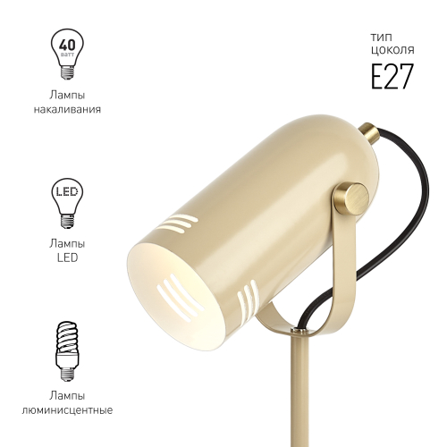 Красивый и удобный настольный светильник ЭРА N-117-Е27-40W-BG в стильном "ретро" корпусе. Может использоваться с разными источниками света - лампой накаливания, компактной люминесцентной лампой (КЛЛ) или светодиодной (LED) лампой. Прочный металлический корпус украшен гальванизированными элементами. Подвижный плафон позволяет регулировать направление света. В числе преимуществ для комфортного использования - устойчивость конструкции и оптимальные размеры для размещения на столе. Трендовый дизайн и актуальное сочетание цветов (бежевый корпус с матовыми золотистыми деталями) сделают этот светильник изюминкой интерьеров, особенно в стиле лофт или минимализм.