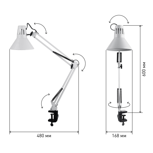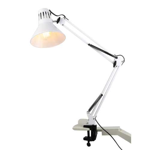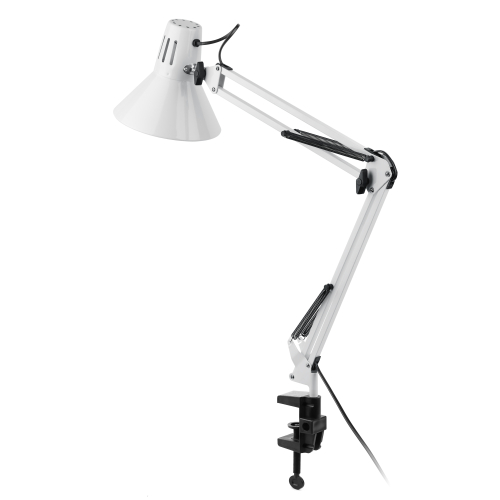Светильник может использоваться с лампой накаливания, компактной люминесцентной лампой (КЛЛ) или светодиодной (LED) лампой. Надежная пластиковая струбцина для крепления к краю поверхности. Металлические стойка и плафон. Высота плафона регулируется двухсекционной сгибающейся стойкой. Направление света регулируется поворотом и наклоном плафона в любом направлении.