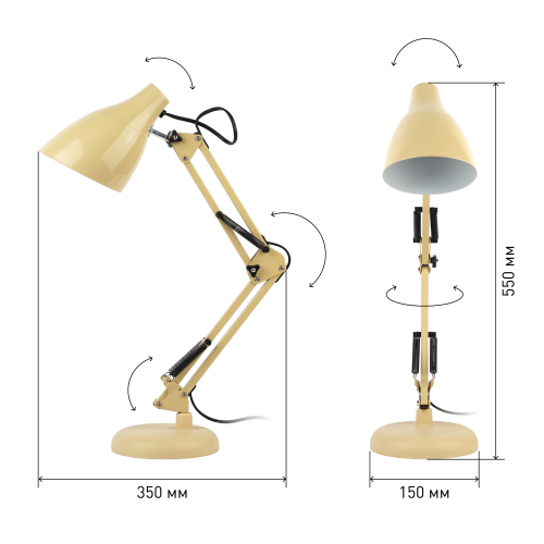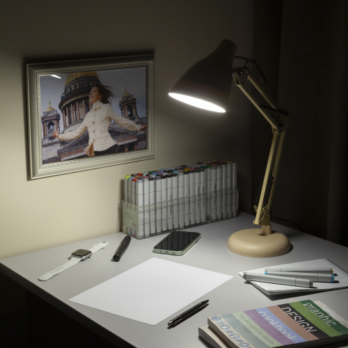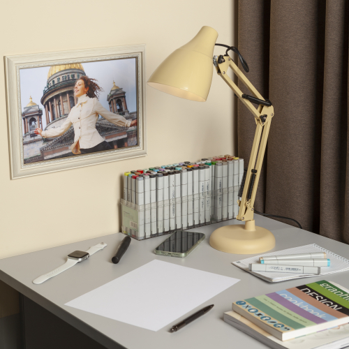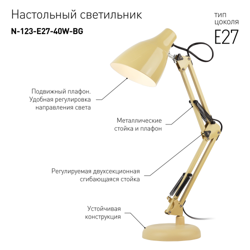 Настольный светильник ЭРА N-123-Е27-40W-BG трендового дизайна с классической конструкцией может использоваться с разными источниками света - лампой накаливания, компактной люминесцентной лампой (КЛЛ) или светодиодной (LED) лампой. Выключатель на проводе. Устойчивое основание. Высота плафона регулируется двухсекционной сгибающейся стойкой, направление света - поворотом и наклоном плафона в любом направлении.