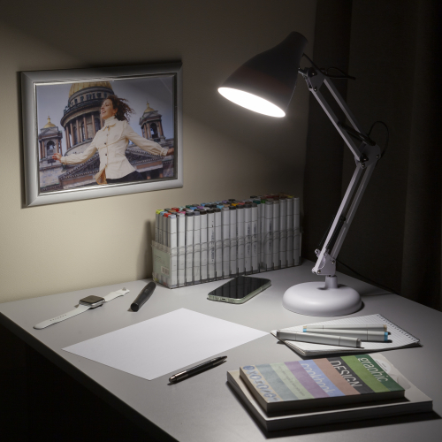 Настольный светильник ЭРА N-123-Е27-40W-W трендового дизайна с классической конструкцией может использоваться с разными источниками света - лампой накаливания, компактной люминесцентной лампой (КЛЛ) или светодиодной (LED) лампой. Выключатель на проводе. Устойчивое основание. Высота плафона регулируется двухсекционной сгибающейся стойкой, направление света - поворотом и наклоном плафона в любом направлении.