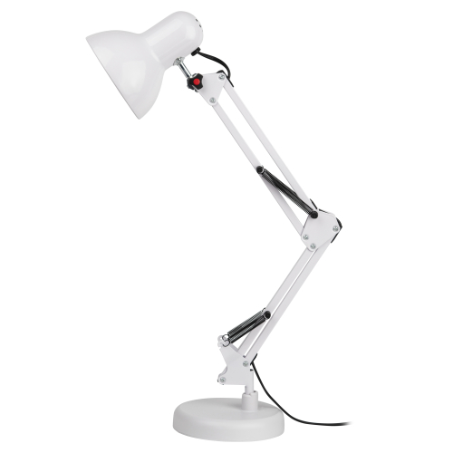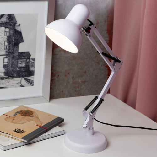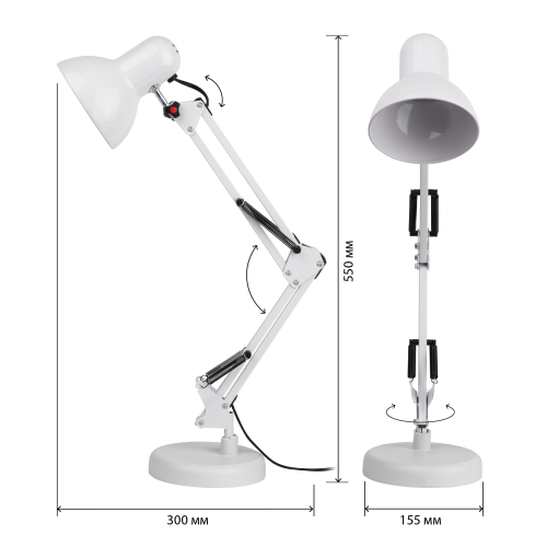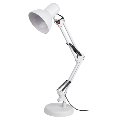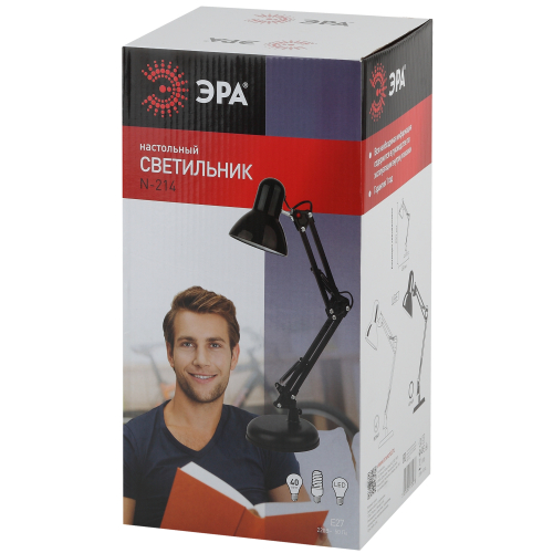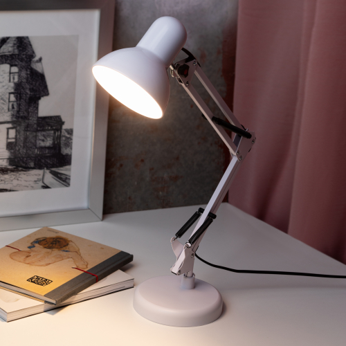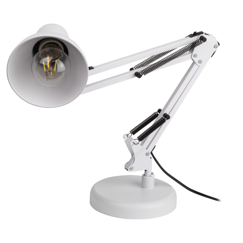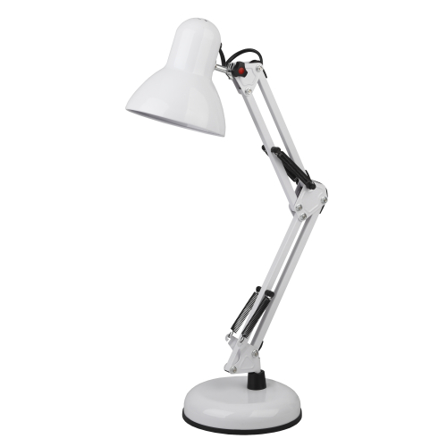 Настольный светильник ЭРА N-214-E27-40W-W классического дизайна может использоваться с разными источниками света - лампой накаливания, компактной люминесцентной лампой (КЛЛ) или светодиодной (LED) лампой. Выключатель на проводе. Устойчивое основание. Высота плафона регулируется двухсекционной сгибающейся стойкой, направление света - поворотом и наклоном плафона в любом направлении.
