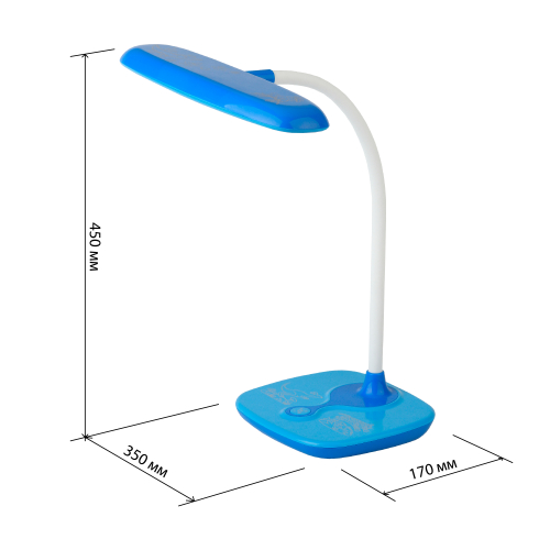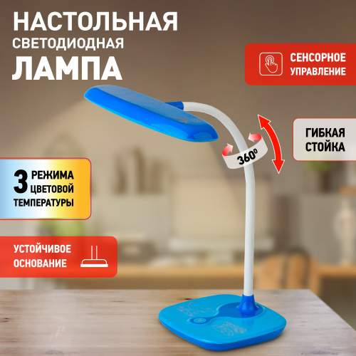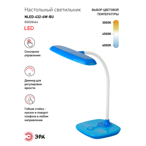 Настольный светильник для детей ЭРА NLED-432-6W-BU со светодиодами (LED) в качестве источников света. Оснащен сенсорным управлением, возможностью выбора цветовой температуры (теплый, нейтральный или холодный свет). Яркость регулируется при помощи плавного диммера. Удобный выбор направления света - наклон и поворот плафона в любом направлении. Яркий детский дизайн с веселым узором на основание оживит комнату и станет верным помощником для ребенка в учебе или творчестве.