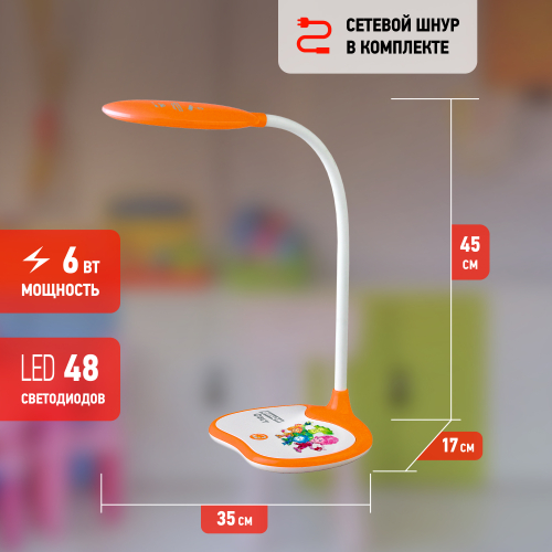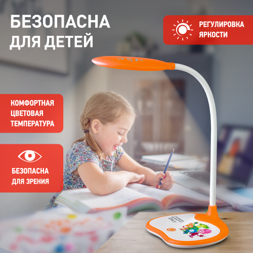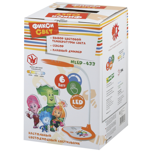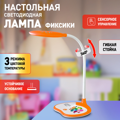 Настольный светильник ЭРА NLED-433-6W-OR серии ФИКСИКИ, созданной по мотивам популярного современного мультфильма. Светильник оснащен сенсорным управлением и возможностью выбора цветовой температуры (теплый, нейтральный или холодный свет). Яркость регулируется при помощи плавного диммера. Плафон наклоняется и поворачивается в любом направлении для максимального комфорта при использовании. Устойчивое основание. Этот современный настольный светильник оценит ребенок, интересующийся гаджетами и новыми технологиями. То есть практически каждый ребенок! Уроки будут делаться с удовольствием!