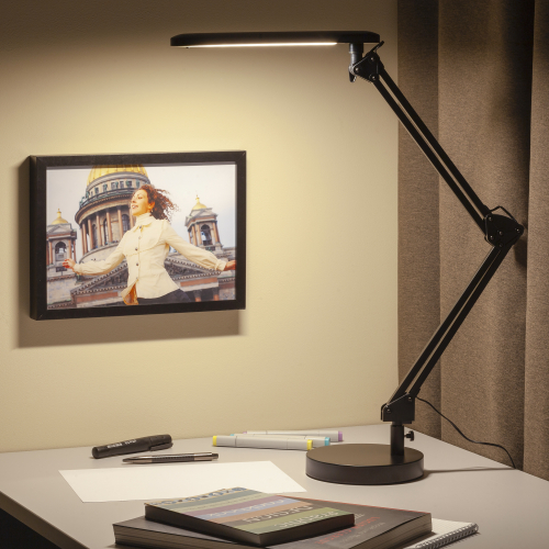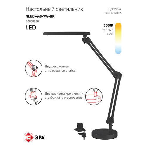 Настольный светильник ЭРА NLED-440-7W-BK со светодиодами (LED) в качестве источников света. Два варианта крепления в комплекте: устойчивое основание и струбцина. Высота плафона регулируется двухсекционной сгибающейся стойкой. Отлично экономит рабочее пространство. Варианты с комбинированным креплением дают возможность выбрать, как будет удобнее использовать светильник - с основанием его можно разместить в любом месте на поверхности стола, со струбциной компактно и надежно закрепить на край.