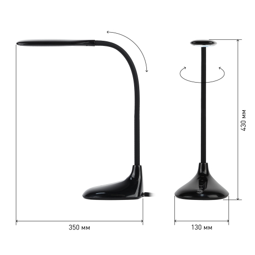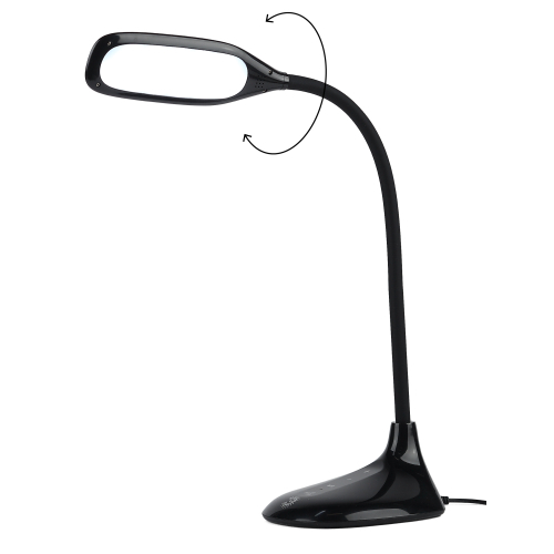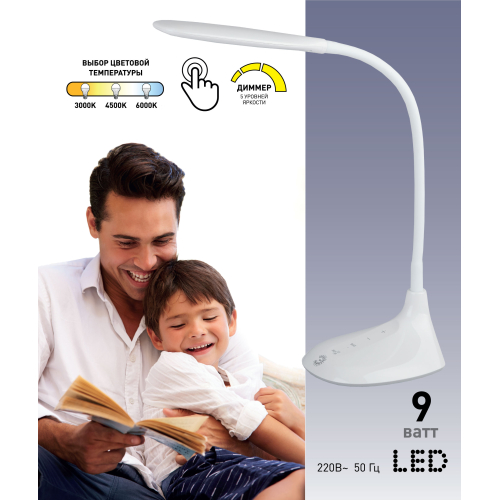 Светильник со светодиодами (LED) в качестве источников света. Выбор цветовой температуры - 3 цвета: 3000К, 4500К, 6000К. Сенсорное переключение. Пятиступенчатый диммер для регулировки яркости. Гибкая стойка - наклон и поворот плафона в любом направлении.