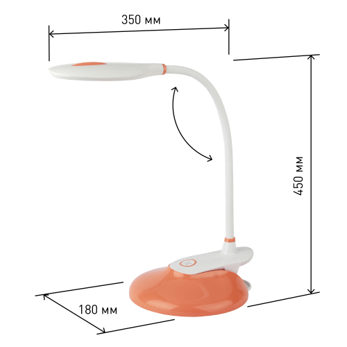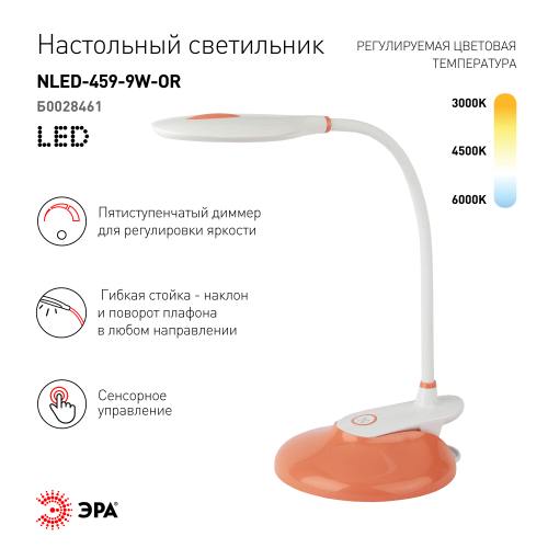 Настольный светильник ЭРА NLED-459-9W-OR со светодиодами (LED) в качестве источников света. Оснащен сенсорным управлением с возможностью выбора цветовой температуры (теплый, нейтральный или холодный свет). Есть регулировка яркости освещения, 5 уровней. Удобный выбор направления света - наклон и поворот плафона в любом направлении. Два варианта крепления: может быть использован как прищепка или как светильник на сновании - в комплект входит съемное основание-вставка. Просто прикрепите прищепку к съемному основанию - получится очень устойчивый вариант для размещения на плоской поверхности.