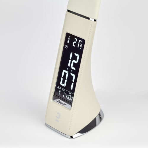 Настольный светильник со светодиодами (LED) в качестве источников света в дизайне под кожу . Нейтральный белый свет - цветовая температура 4000К. Сенсорное переключение. Трехступенчатый диммер для регулировки яркости. ЖК дисплей с функциями часов, будильника, календаря и термометра. Выбор яркости дисплея с возможностью его выключения.