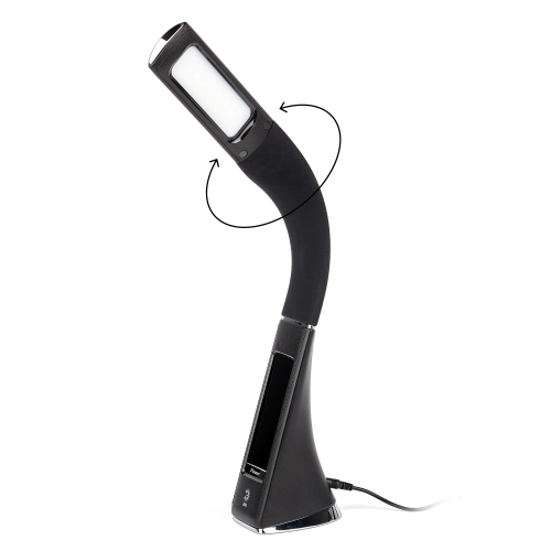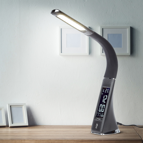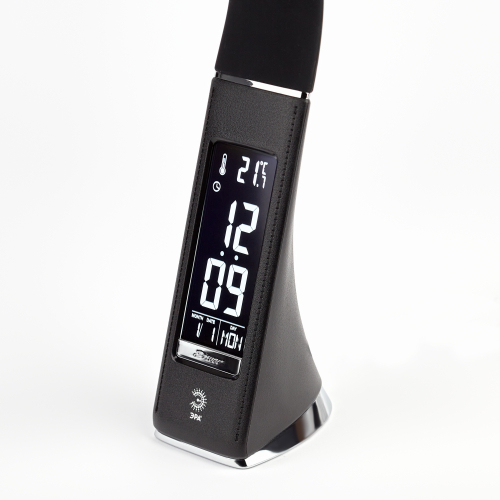 Настольный светильник со светодиодами (LED) в качестве источников света в дизайне под кожу . Нейтральный белый свет - цветовая температура 4000К. Сенсорное переключение. Трехступенчатый диммер для регулировки яркости. ЖК дисплей с функциями часов, будильника, календаря и термометра. Выбор яркости дисплея с возможностью его выключения.