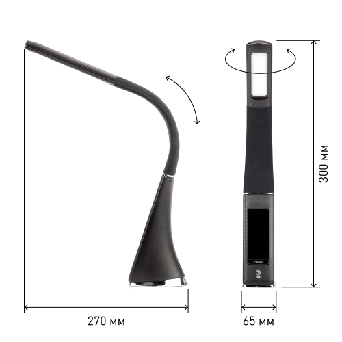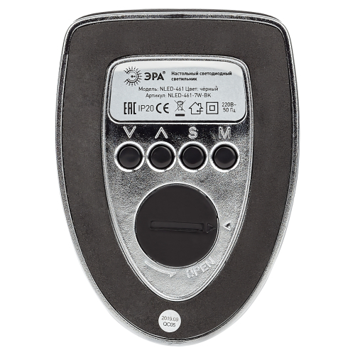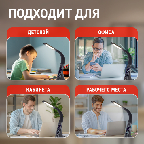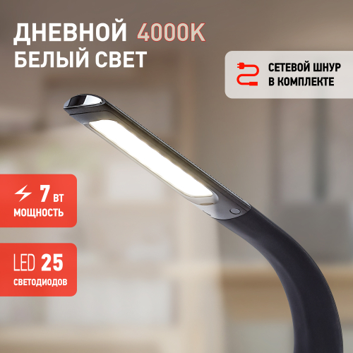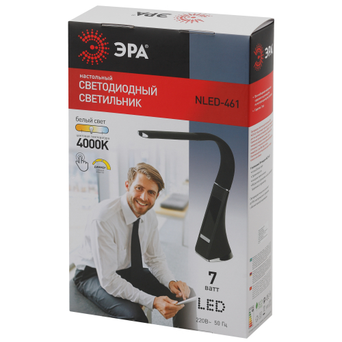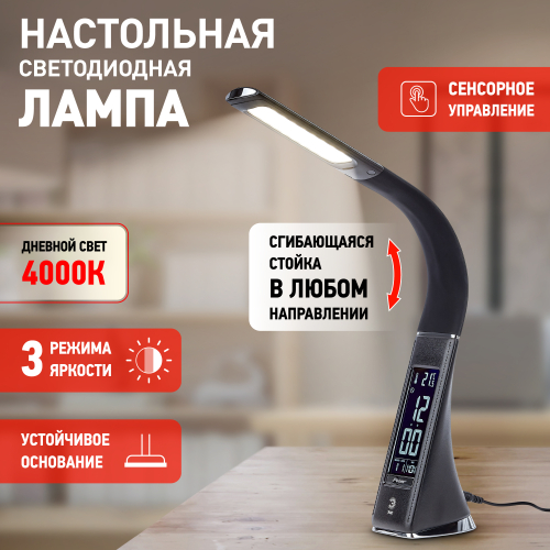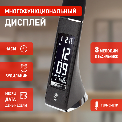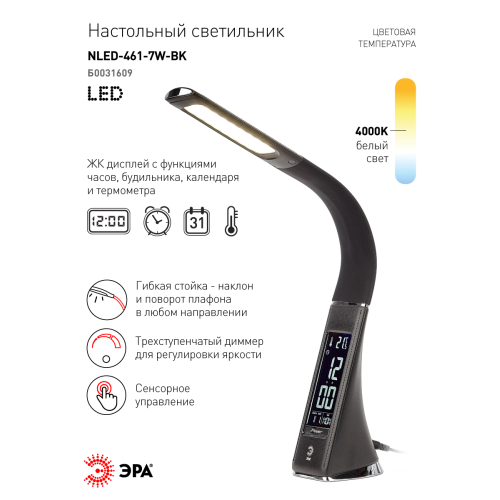 Настольный светильник ЭРА NLED-461-7W-BK со светодиодами (LED) в качестве источников света в дизайне "под кожу". Оснащен сенсорным управлением, есть регулировки яркости освещения - 3 уровня. Главное преимущество светильника - ЖК дисплей с функциями часов, будильника, календаря и термометра. Сенсорная кнопка с обратной стороны стойки обеспечивает опцию выбора яркости дисплея с возможностью его выключения. Высота плафона регулируется гибкой стойкой, направление света регулируется поворотом плафона в любом направлении.