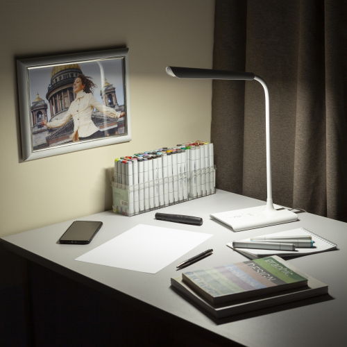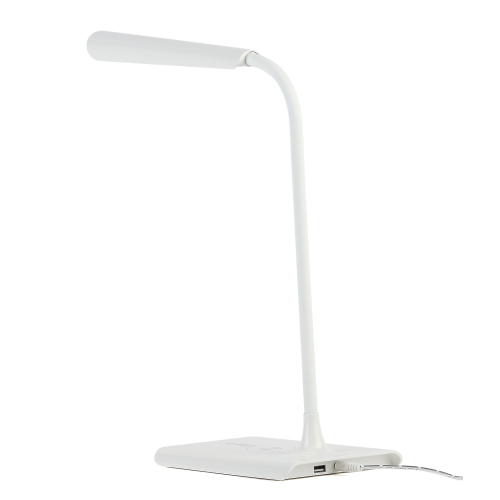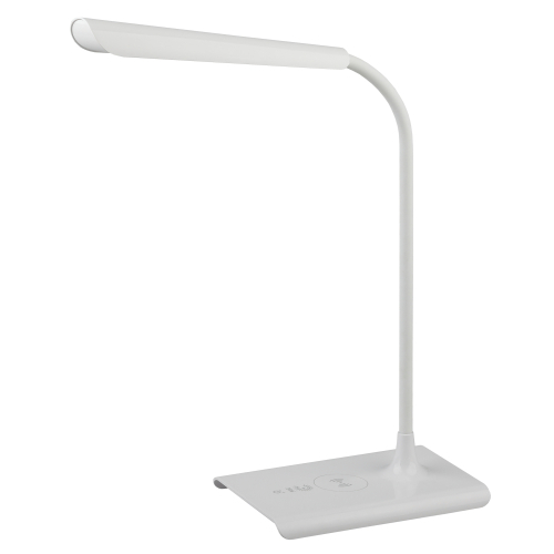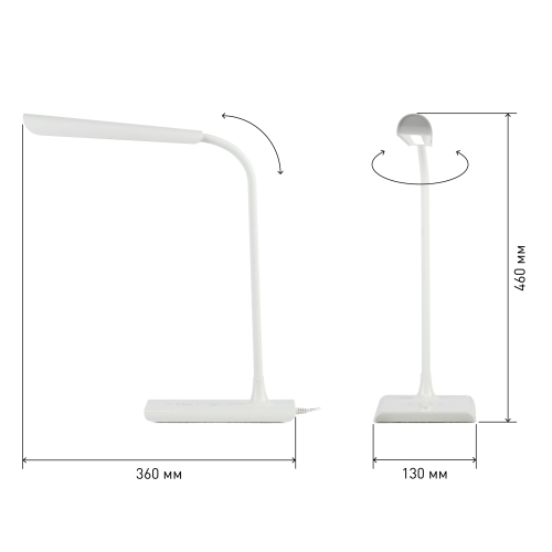 Светильник со светодиодами (LED) в качестве источников света. Цветовая температура 4000К. Сенсорное переключение. Плавный диммер для регулировки яркости. Функция беспроводной зарядки. В комплекте внешние модули беспроводной зарядки: Lightning (для iPhone 5 и выше) и Micro-USB (для Android). USB разъем для зарядки устройств. Высота плафона регулируется гибкой стойкой, направление света регулируется поворотом плафона в любом направлении.