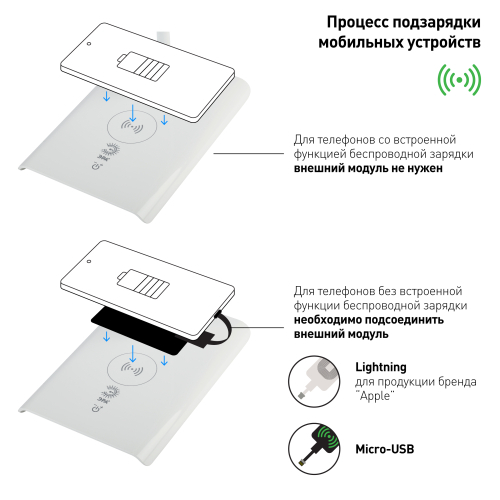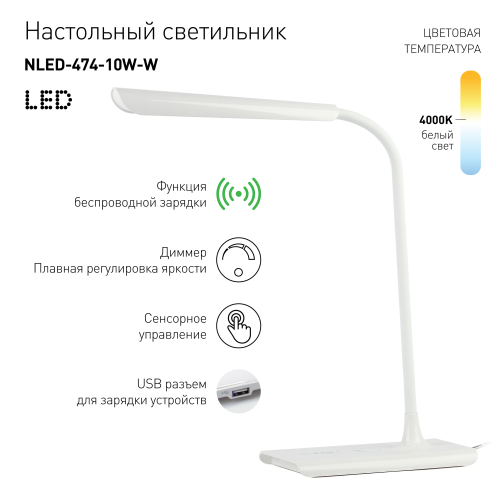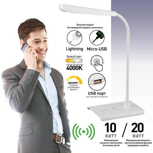 Настольный светильник ЭРА NLED-474-10W-W позволяет не только с комфортом читать или работать за столом, но и заряжать мобильные устройства от встроенного порта USB или беспроводным способом. Даже если такая функция не встроена в сам гаджет, в комплекте поставки 2 модуля, подключаемых к телефону для обеспечения функции беспроводной зарядки: с разъемом для iPhone (Lightning) и Android (микро-USB). Встроенный USB порт при желании позволяет заряжать, например, планшет или второй телефон одновременно с беспроводной зарядкой, это очень удобно. Управление светильником осуществляется при помощи сенсорных кнопок на основании, есть возможность плавной регулировки яркости. Корпус светильника глянцевый, а гибкая стойка покрыта приятным на ощупь материалом софт-тач.