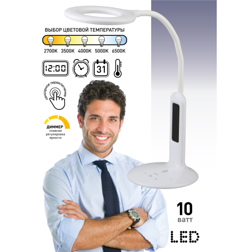 Настольный светильник ЭРА NLED-476-10W-BK со светодиодами (LED) в качестве источников света. У светильника сенсорное управление, плавный или ступенчатый (на выбор) диммер для регулировки яркости. 5 режимов цветовой температуры света: мягкий теплый свет, теплый свет, белый свет, дневной свет, холодный свет. Главное преимущество светильника - ЖК дисплей с функциями часов, будильника, календаря и термометра. Светильник сохраняет выбранные настройки света при включении-выключении. Высота плафона регулируется гибкой стойкой, направление света - поворотом плафона в любом направлении. Плафон кольцевой формы оптимально распределяет свет, это очень удобно и отлично подходит для мелкой ручной работы.