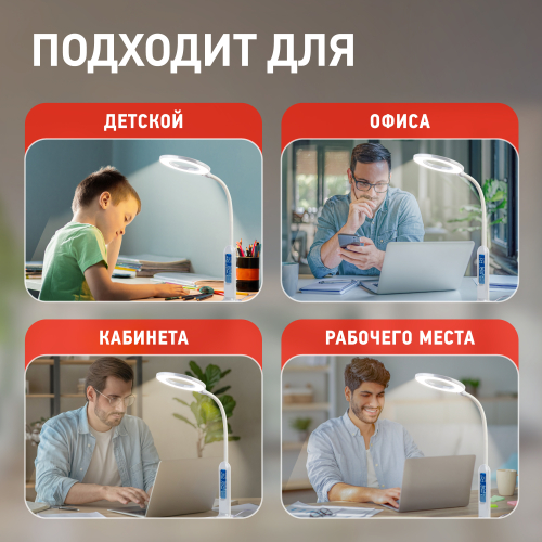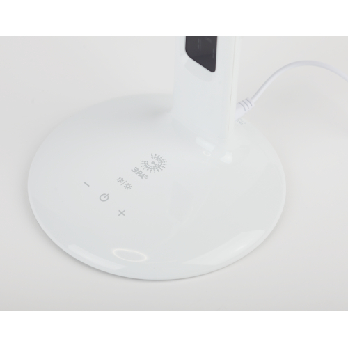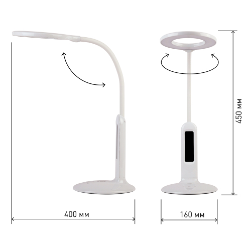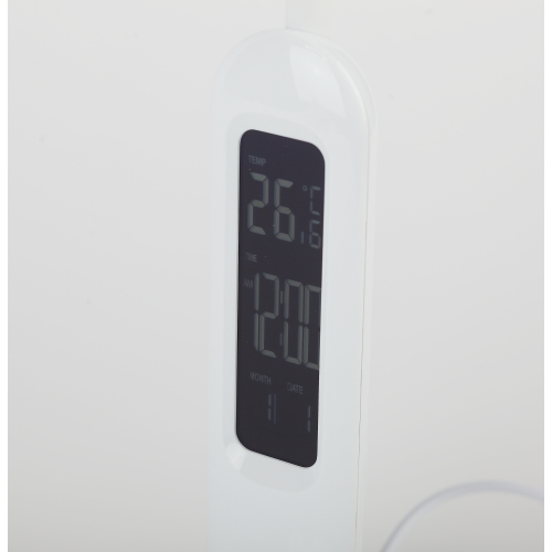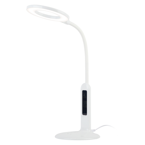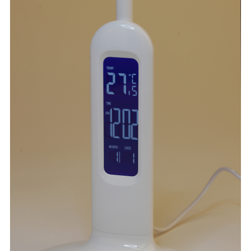 Настольный светильник со светодиодами (LED) в качестве источников света. 5 режимов цветовой температуры света: 2700К - мягкий теплый свет, 3500К - теплый свет, 4000К - белый свет, 5000К - дневной свет, 6500К - холодный свет. Сенсорный переключатель на основании. Плавный или ступенчатый (на выбор) диммер для регулировки яркости. ЖК дисплей с функциями часов, будильника, календаря и термометра. Выбор яркости дисплея с возможностью его выключения. Сохранение выбранных настроек света при включении-выключении. Гибкая стойка.