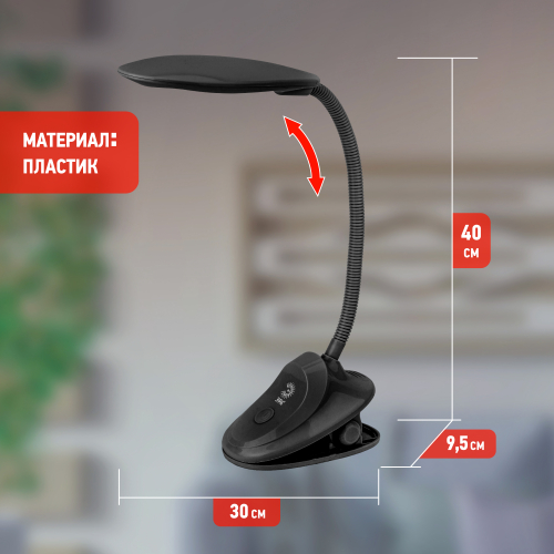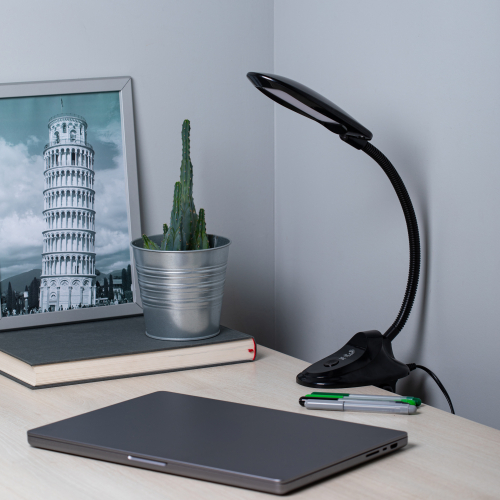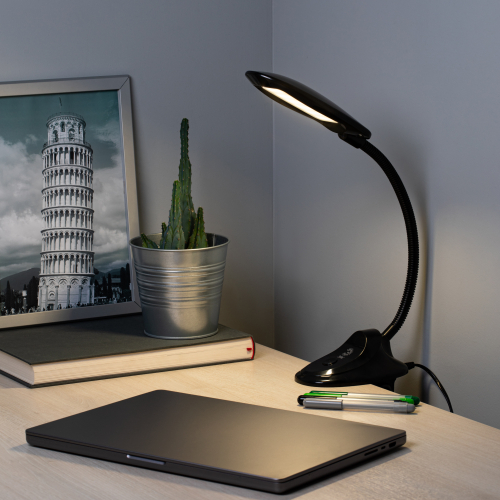 Настольный светильник-прищепка ЭРА NLED-478-8W-BK со светодиодами (LED) в качестве источников света. У светильника выключатель на основании. Это базовая модель с оптимальным универсальным дизайном хорошей для работы за столом высоты. Гибкая стойка позволяет выбирать наиболее комфортное направление света.