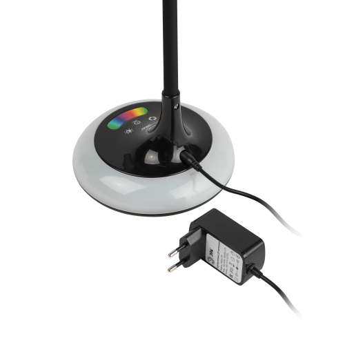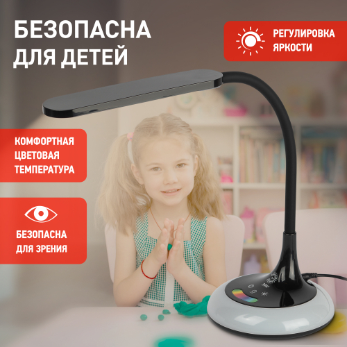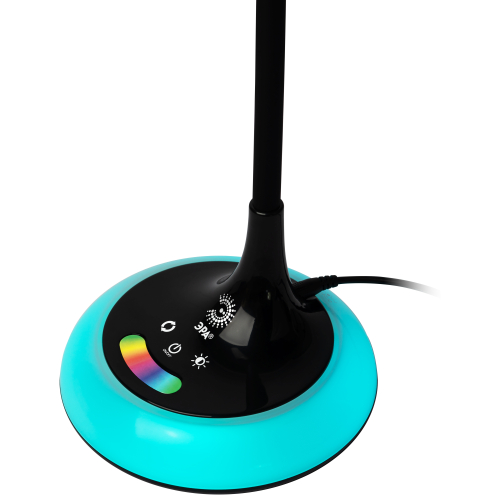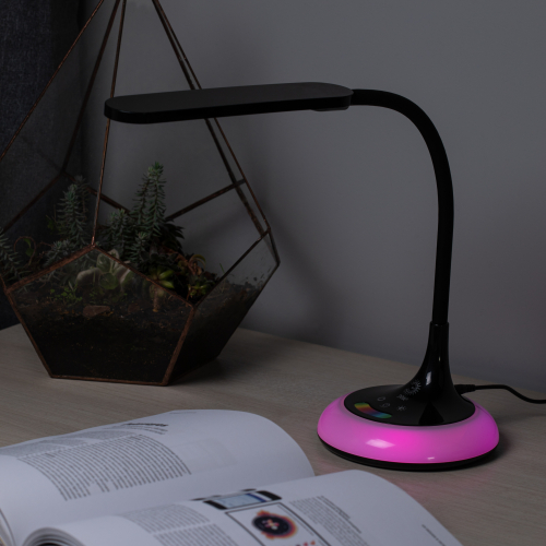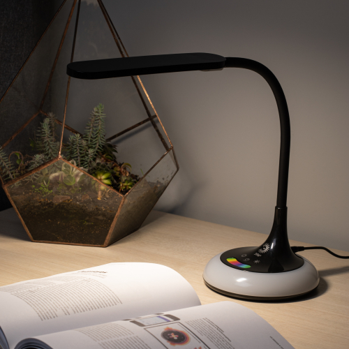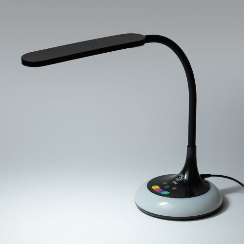 Настольный светильник со светодиодами (LED) в качестве источников света. Выбор цветовой температуры - 3 цвета: 3000К, 4500К, 6000К. Сенсорный переключатель на основании. Плавный диммер для регулировки яркости. RGB LED ночник на основании с независимым сенсорным переключателем, с выбором режимов свечения. Светильник сохраняет выбранные настройки при включении-выключении. Гибкая стойка.
