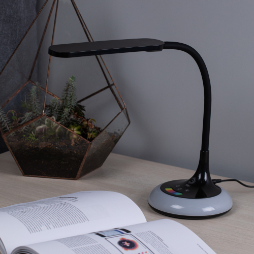 Настольный светильник со светодиодами (LED) в качестве источников света, 10 Вт. Изменяемая цветовая температура: 3000К, 4500К, 6000К. Сенсорное управление. Плавный диммер. LED ночник на основании с независимым сенсорным переключателем, с выбором режимов свечения. Светильник сохраняет выбранные настройки при включении-выключении. Гибкая стойка позволяет выбирать наиболее комфортное направление света.