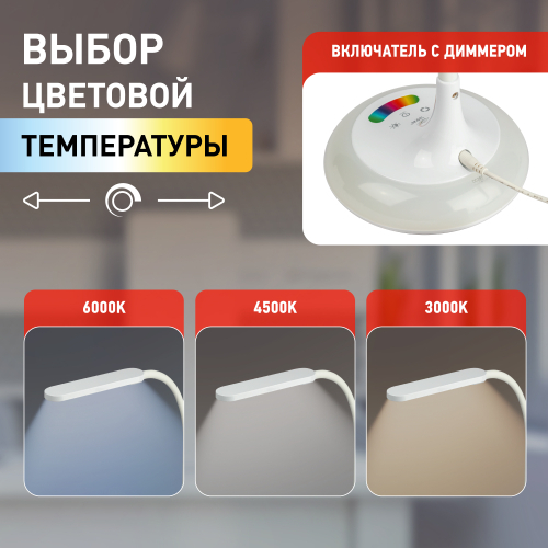 Настольный светильник со светодиодами (LED) в качестве источников света, 10 Вт. Изменяемая цветовая температура: 3000К, 4500К, 6000К. Сенсорное управление. Плавный диммер. LED ночник на основании с независимым сенсорным переключателем, с выбором режимов свечения. Светильник сохраняет выбранные настройки при включении-выключении. Гибкая стойка позволяет выбирать наиболее комфортное направление света.