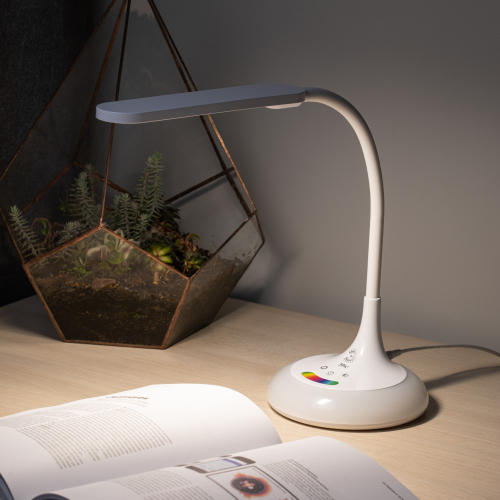 Настольный светильник со светодиодами (LED) в качестве источников света. Выбор цветовой температуры - 3 цвета: 3000К, 4500К, 6000К. Сенсорный переключатель на основании. Плавный диммер для регулировки яркости. RGB LED ночник на основании с независимым сенсорным переключателем, с выбором режимов свечения. Светильник сохраняет выбранные настройки при включении-выключении. Гибкая стойка.